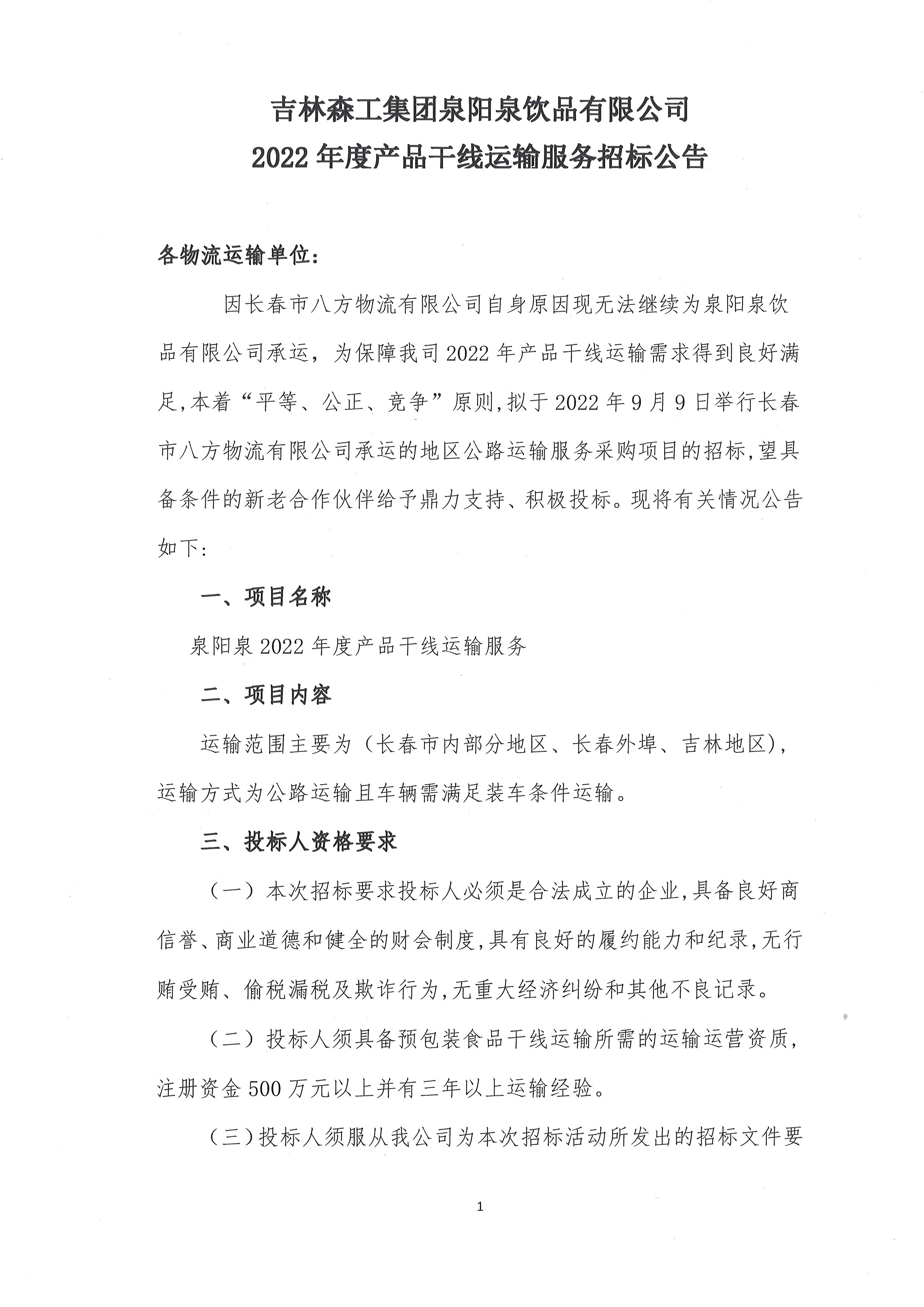 2022年度產(chǎn)品干線運輸服務招標公告